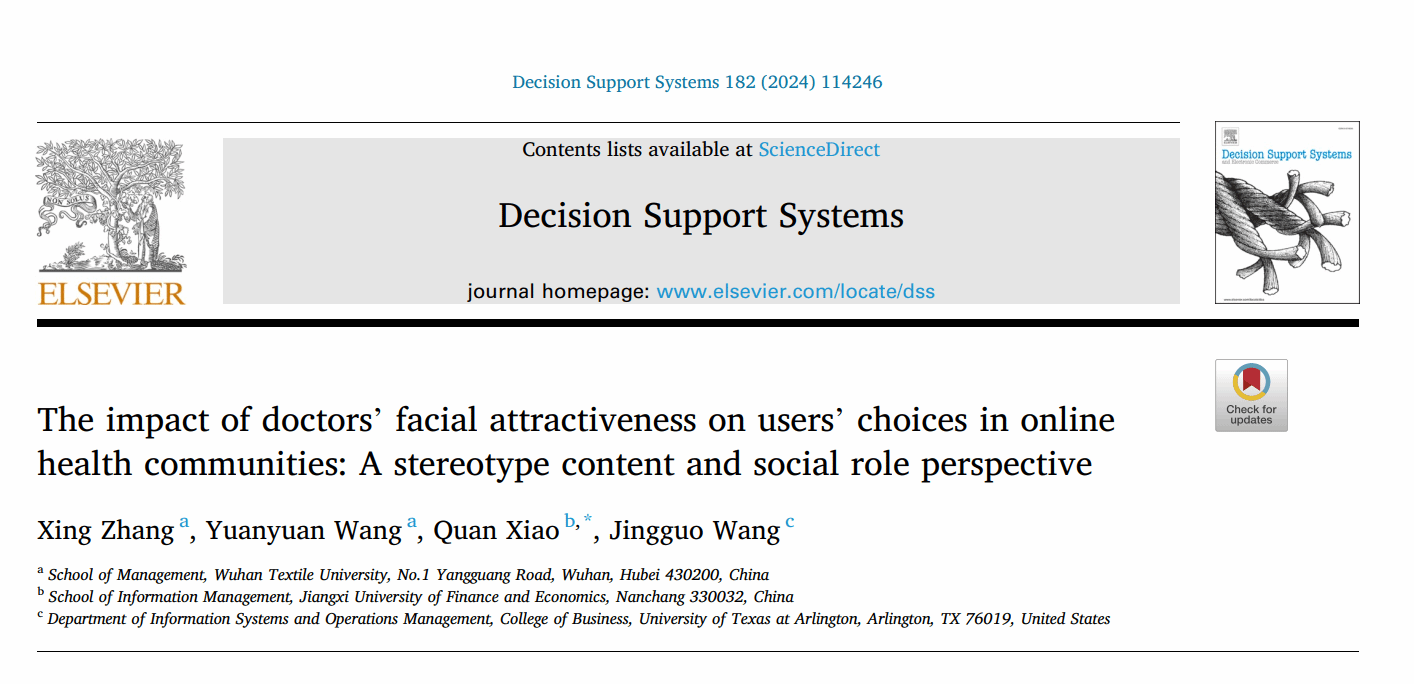 近日,信息管理领域国际权威期刊《Decision Support Systems》发表了beat365官网中文版本张星教授作为第一作者撰写的论文《The impact of doctors’ facial attractiveness on users’ choices in online health communities: A stereotype content and social role perspective》(医生面部吸引力对在线健康社区用户选择的影响:一种刻板印象内容和社会角色视角)。beat365官网中文版本为论文第一单位,beat365官网中文版本硕士研究生王圆圆、江西财经大学肖泉教授和美国得克萨斯州大学阿灵顿分校汪静国教授是论文的共同作者。