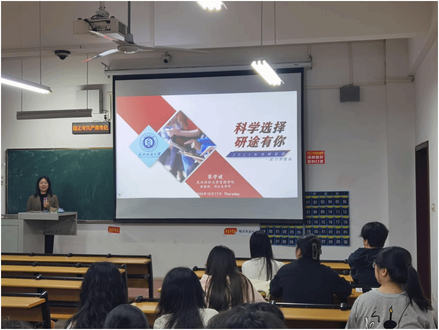 10月17日在汉口公司的考研招生宣讲会上,蔡学媛老师从研究生报名注意事项、备考锦囊、院校和专业选择三个方面进行了介绍,提供大量的往届毕业生考研数据为同学们的选择提供参考,推荐了考研冲刺复习的技巧和方法。同时,她向同学们介绍了公司的研究生招生计划,欢迎大家将beat365官网中文版本纳入考研选择目标。