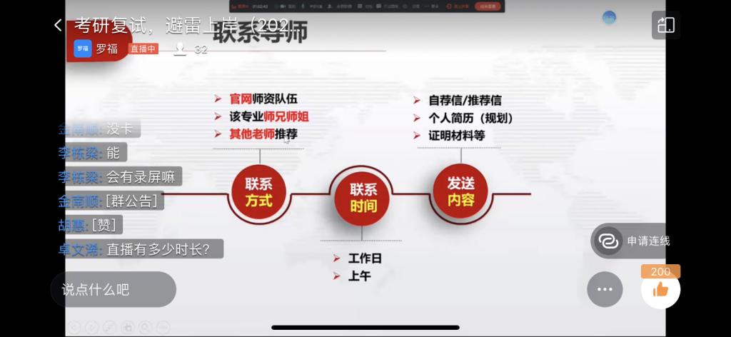 3月7日上午,beat365官网中文版本在钉钉平台开展朋辈领航考研复试讲座,本次讲座邀请到beat365官网中文版本研究生员工罗福担任此次讲座的主讲人。近三百余名大二、大三、大四同学线上聆听。