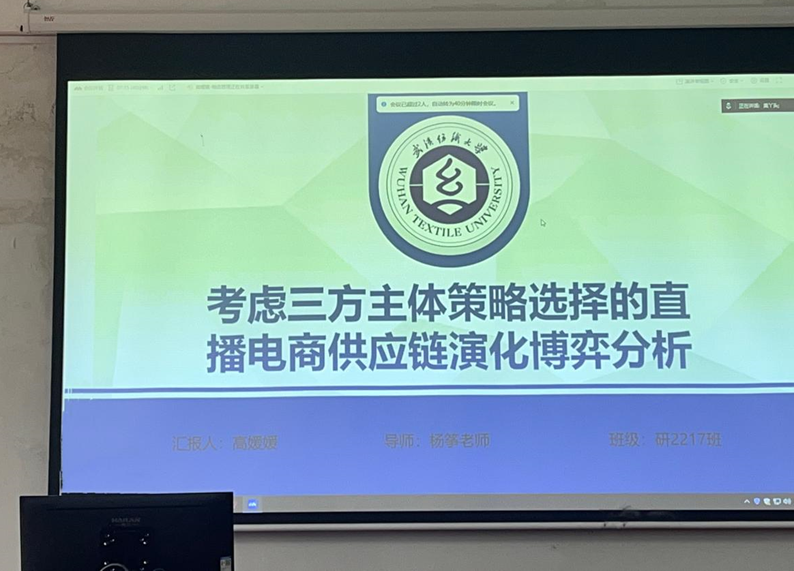 首先,高媛媛同学在线上汇报了她的论文《考虑三方主体策略选择的直播电商供应链演化博弈分析》。她从直播电商供应链的现状出发,结合博弈论模型,深入分析了供应链中三方主体的策略选择及其演化路径。王雪老师对高媛媛的研究给予了高度评价,并建议她在模型中加入更多实际案例,以增强研究的实践指导意义。
