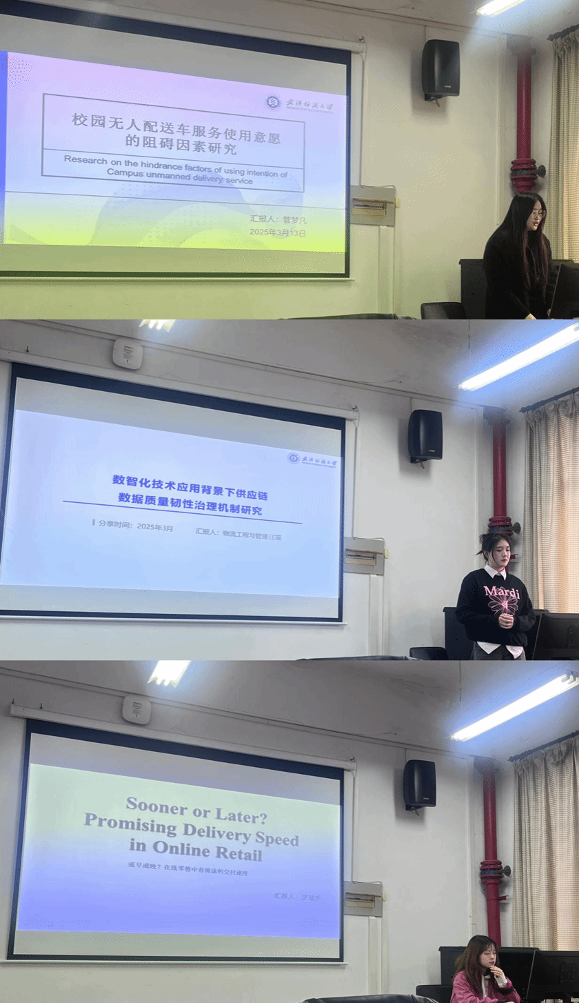 2025年3月13日,阳光校区7-536教室学术氛围热烈,2025年第4期崇德学术沙龙在此进行。本期沙龙特邀beat365官网中文版本马吉峰老师担任指导嘉宾,5位同学围绕无人配送技术、数智化供应链、电商物流时效、数据安全治理及农业现代化等前沿议题展开研究成果分享,师生互动深入,学术观点碰撞交融。