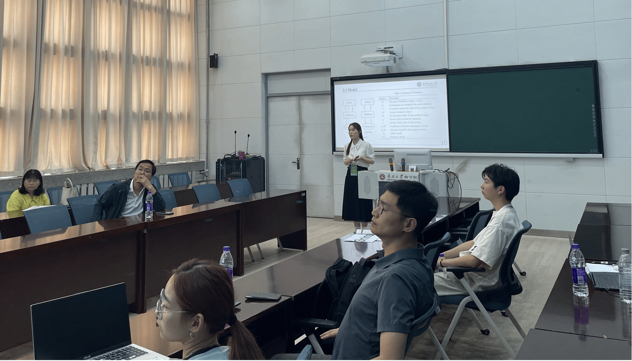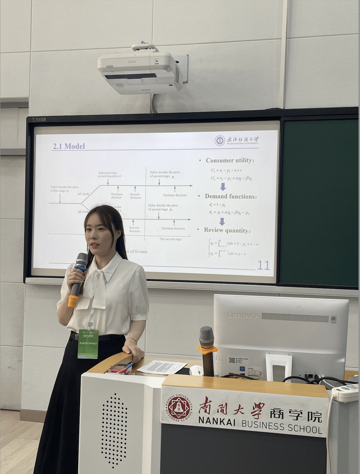 6月8日下午,在南开大学商公司 “AI Promotes Smart Manufacturing and Its Sustainable Operations”分会场,研究生赵铭慧汇报了余牛教授指导的研究论文《Managing Online Reviews via Rebate Incentives in E-Commerce Supply Chains》。此次国际会议运用英文进行汇报交流,研究报告吸引了国内外顶尖学者与研究生的关注,会议期间公司师生与来自南开大学、天津理工大学、西安交通大学、华中农业大学、曲阜师范大学等国内外知名高校的专家与学者进行了学术探讨与交流。