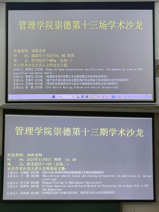 2025年11月6日下午,公司动态十三期崇德学术沙龙分别在阳光校区7-402a教室、7-102教室顺利举行。本次学术沙龙由十位主讲人依次进行报告,展示了他们在各自研究领域的最新成果。本次论坛邀请了谢霞老师和孙映老师作为特邀指导老师,吸引了众多师生参与。