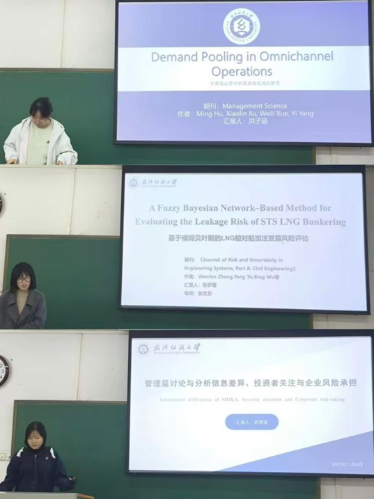 洪子涵同学以《Demand Pooling in Omnichannel Operations》为题,探讨全渠道运营中的需求池化问题。张梦蕾同学作了《A Fuzzy Bayesian network - based Method for Evaluating the Leakage Risk of STS LNG Bunkering》的报告,针对STS LNG Bunkering的泄漏风险评估提出新方法。武梦涵同学分享了《管理层讨论与分析信息差异、投资者关注与企业风险承担》,研究企业管理层信息与投资者关注和企业风险承担的关系为企业完善信息披露策略和风险管理提供有益的启示。