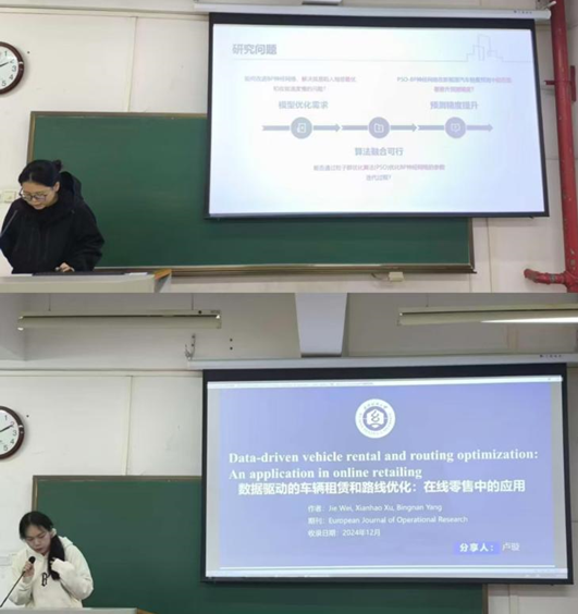 分会场7-102教室,宋琬婷同学的报告《基于PSO - BP神经网络的新能源汽车销量预测模型》,介绍了新能源汽车销量预测的新模型。卢璇同学带来《Data - driven vehicle rental and routing optimization: An application in online retailing》,聚焦在线零售中的车辆租赁与路径优化。