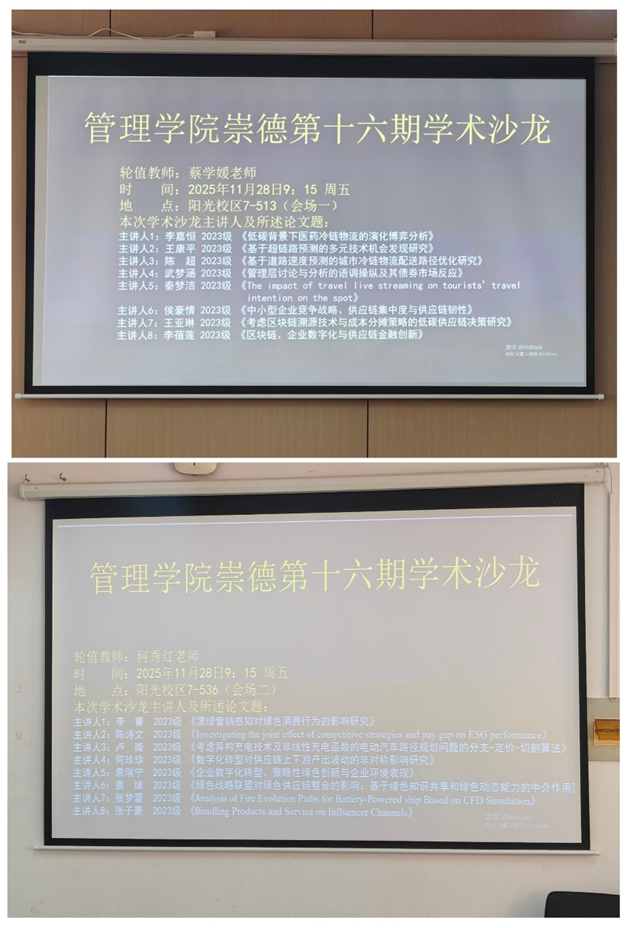 2025年11月28日上午,公司动态16期“崇德”学术沙龙分别在阳光校区7-513教室和7-536教室如期举行。本次沙龙特邀蔡学媛老师和何秀红老师担任评委老师,对16位主讲人最新的学术研究分享进行点评。