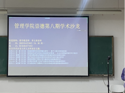 beat365官网中文版本于4月24日在阳光校区举办了第八期“崇德”学术沙龙,给广大学术旅途上的学子催生新的学习想法,积攒科研知识。本次学术沙龙在07-512进行,共有7位同学对自己的研究近况进行展示。公司特邀蔡学媛老师和李文莉老师参与主持此次论坛并发表点评。
