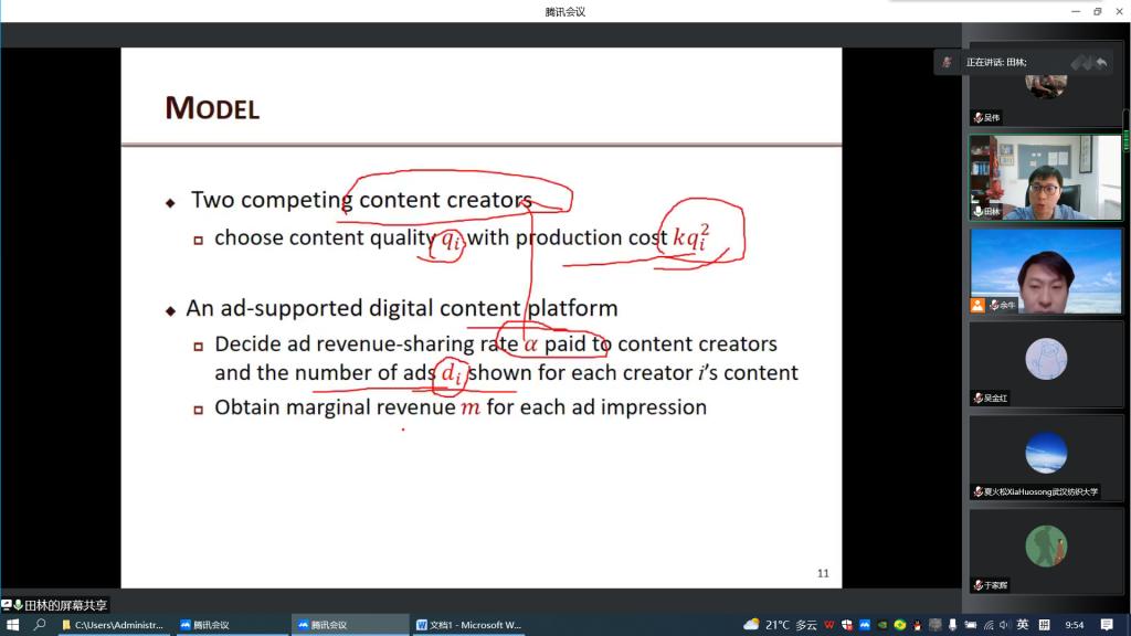 会议伊始,吴金红经理作致辞,对田林教授的到来表示热烈欢迎,随后,主持人余牛教授介绍了田林教授主要研究方向和学术成果。田林教授以视频广告为背景,简介了数字内容市场概况,表明其市场近年来在急剧增长,许多平台(如You Tube、Twitch和Instagram)在平台观看内容时显示广告,他们与内容创造者分享广告收入,以鼓励他们创建和分享内容。这些平台通常采用统一的广告格式(即平台显示相同数量的广告,而不考虑内容质量)或差异化的广告格式(即平台基于内容质量显示广告数量)。